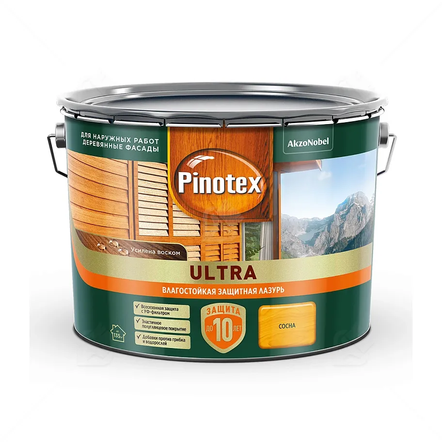 Купить декоративную пропитку для защиты древесины Pinotex Ultra в Москве теперь стало еще проще. Pinotex Ultra — это влагостойкая защитная лазурь для дерева, обеспечивающая до 10 лет защиты. Эта пропитка всесезонная, с УФ-фильтром, препятствует грибковым заражениям и появлению плесени, образует эластичное полуглянцевое покрытие с грязе- и водоотталкивающими свойствами. Усиленная воском, она создает прочное и эластичное защитное покрытие, которое не растрескивается.
