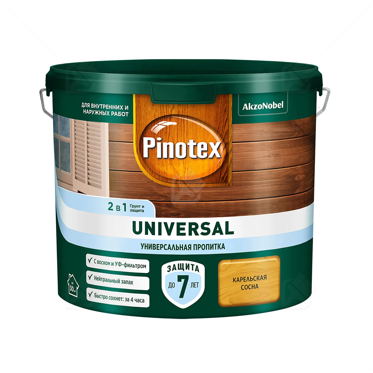 Пропитка для дерева Pinotex Universal 2 в 1 используется как для наружных работ, так и безопасна для применения внутри помещений (универсальная), т.к. не содержит биоцидных добавок, не выделяет вредных веществ. Формула 2 в 1: наносится без грунта, питает и защищает от влаги и загрязнений. Окрашенная поверхность устойчива к воздействию солнца, дождя, снега и мороза. Пинотекс Универсал 2в1 легко наносится и быстро впитывается в поверхность древесины, образуя полуматовое покрытие. Подчеркивает естественную текстуру древесины, будь то береза, орегон, палисандр, скандинавский серый или индонезийский тик. Вы можете купить пропитку Pinotex Universal 2 в 1 в емкости 9 литров для длительного использования.